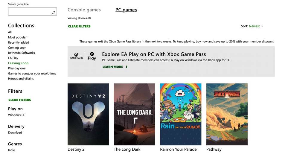 Madden NFL 20 Narita Boy and Shadow Warrior 2 are all leaving Xbox Game Pass on March 31 and then on April 11 Destiny 2 and its expansions will leave the PC version of Game Pass. Destiny 2 and. By Tom Warren tomwarren Oct 5 2021 1047am EDT.